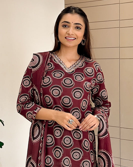 Maroon Cotton Spiral Printed Kurta Pant Set With Dupatta