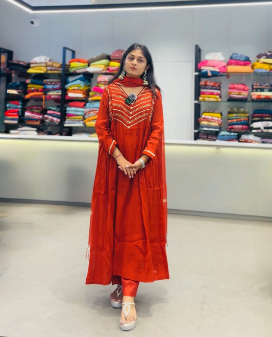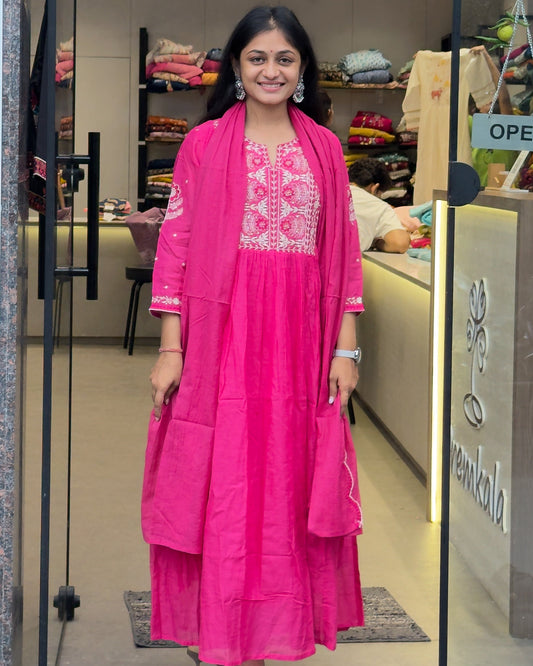 Mal Chanderi A-Line Round Kurta Pant Set With Dupatta