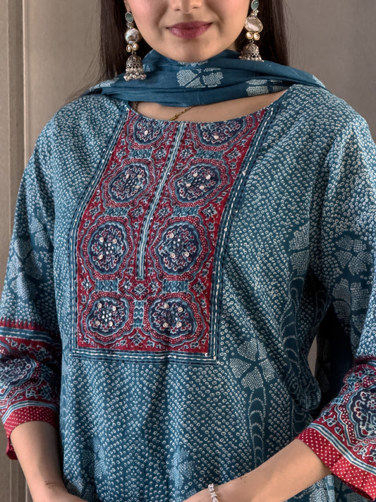 Blue Cotton Bandhani Kurta Pant Set with Dupatta
