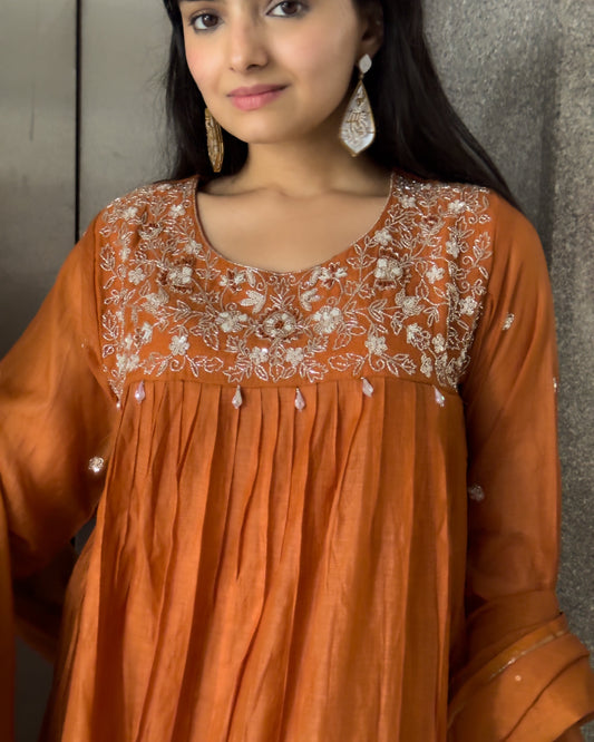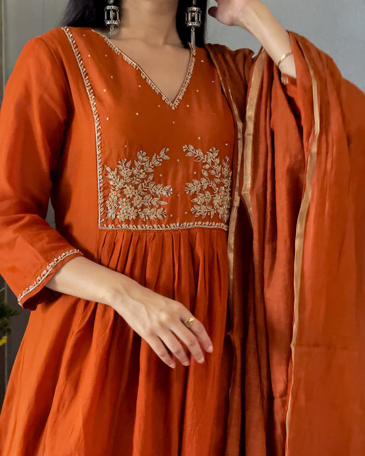 Rust A-Line Round Kurta Pant Set with Dupatta