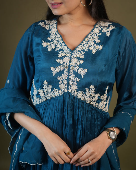 Teal Blue Aliya Cut Kurta Palazzo Set with Dupatta