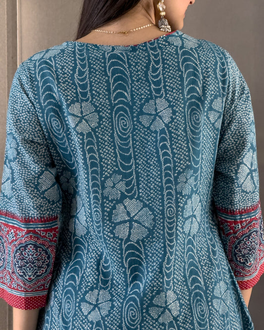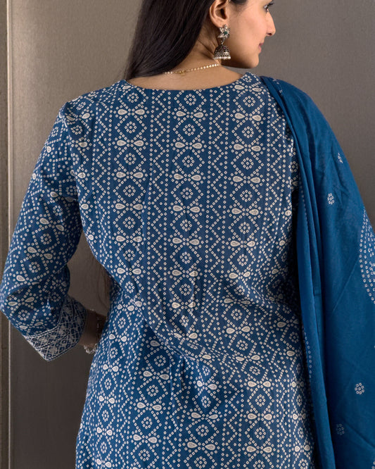 Blue Cotton Bandhani Kurta Pant Set with Dupatta