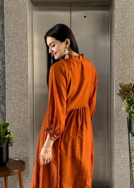 Rust A-Line Round Kurta Pant Set with Dupatta