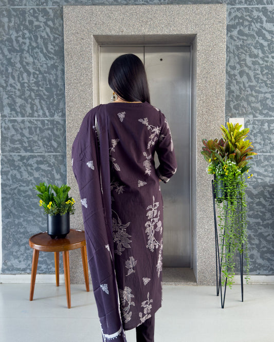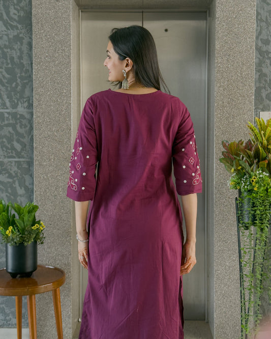 New Beet Cotton Embroidered A-Line Kurta Pant Set For Women