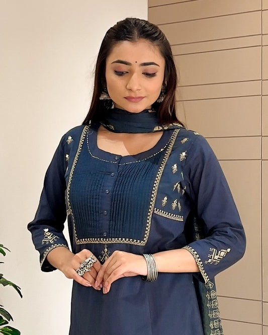 Teal Blue Cotton Straight Kurta Palazzo Set With Dupatta