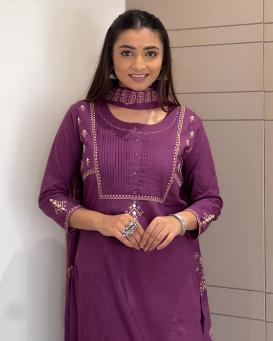 Wine Cotton Straight Kurta Palazzo Set With Dupatta