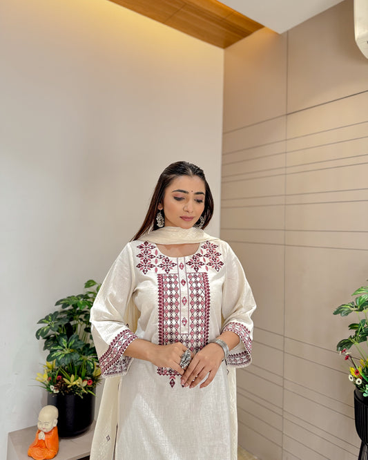 White Cotton Embroidery Work Straight Kurta Pant Set