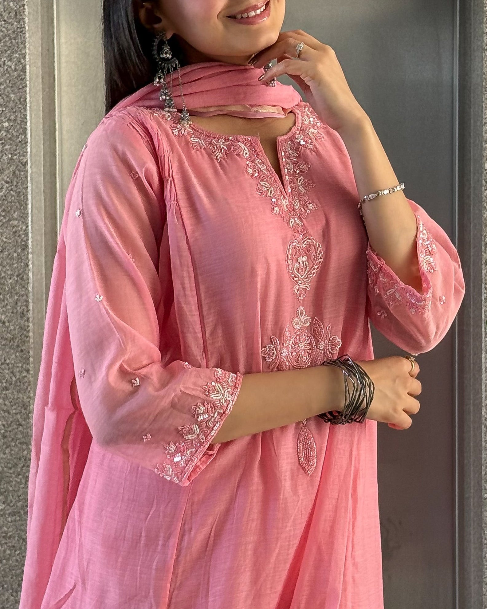Baby Pink A Line Kurta Pant Set with Dupatta