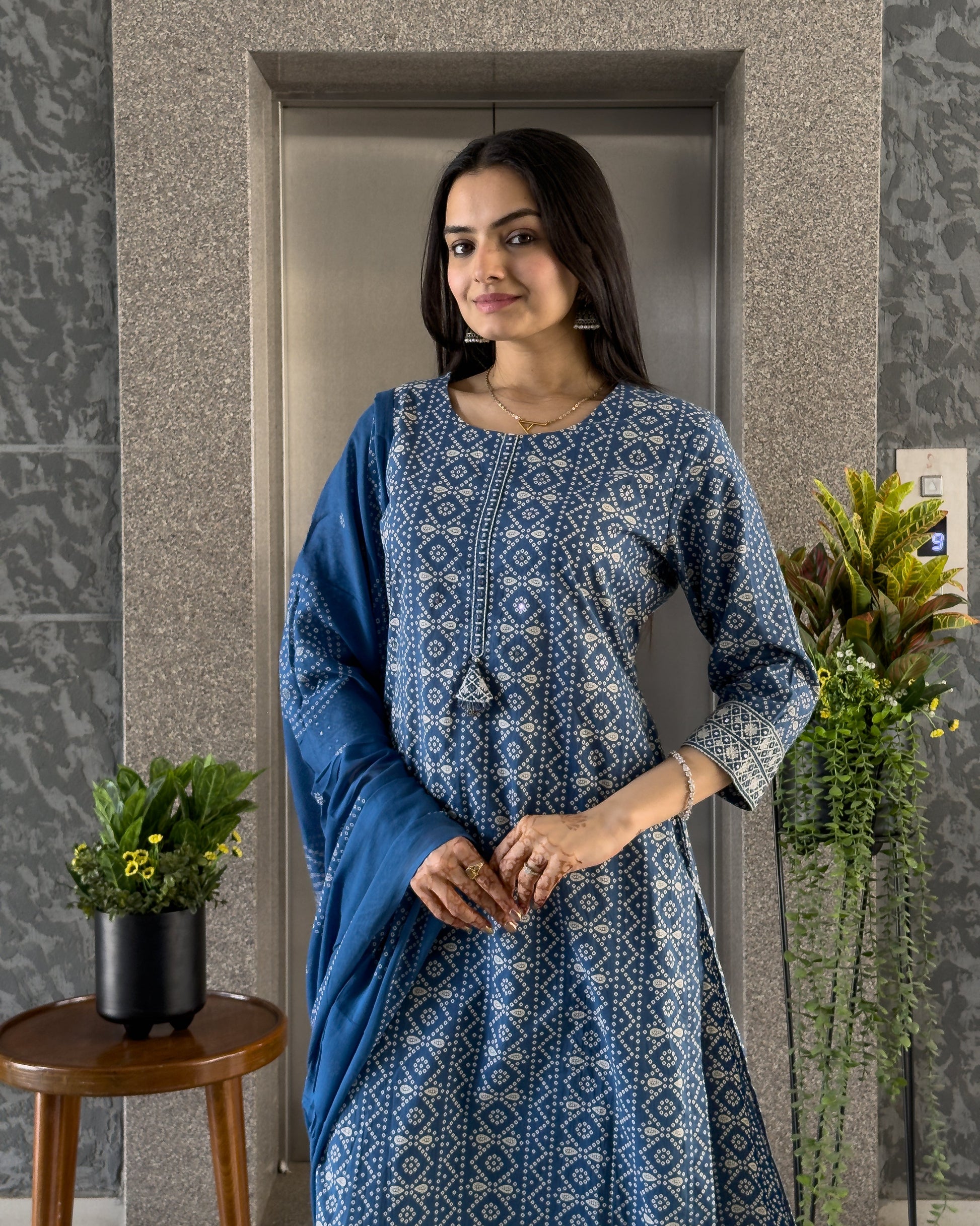 Blue Cotton Bandhani Kurta Pant Set with Dupatta