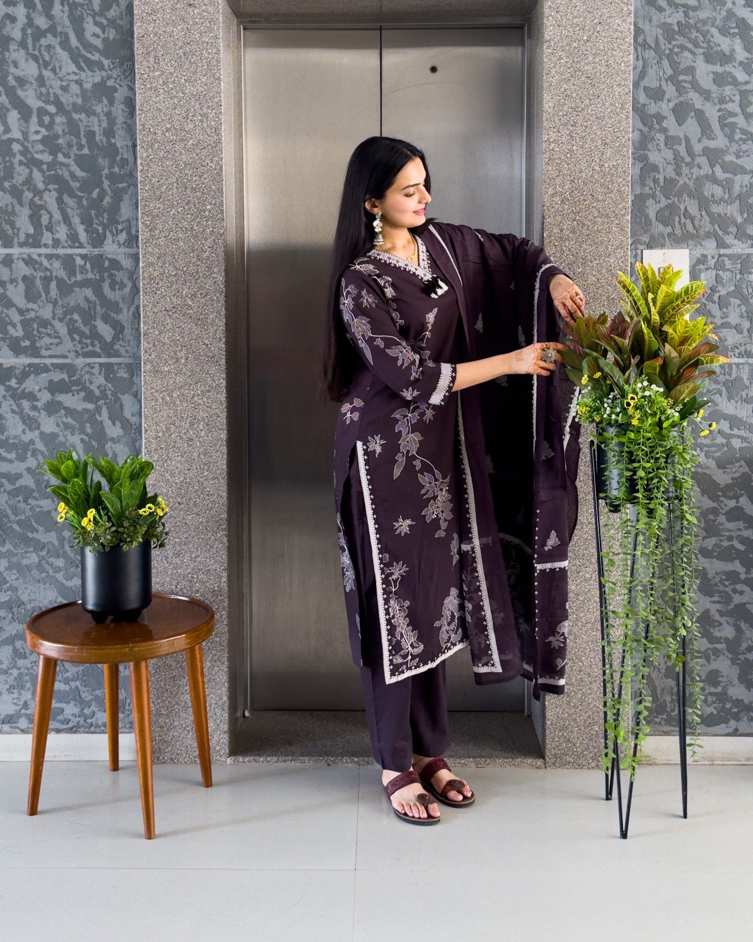 Dark Wine Straight Kurta Pant Set with Dupatta