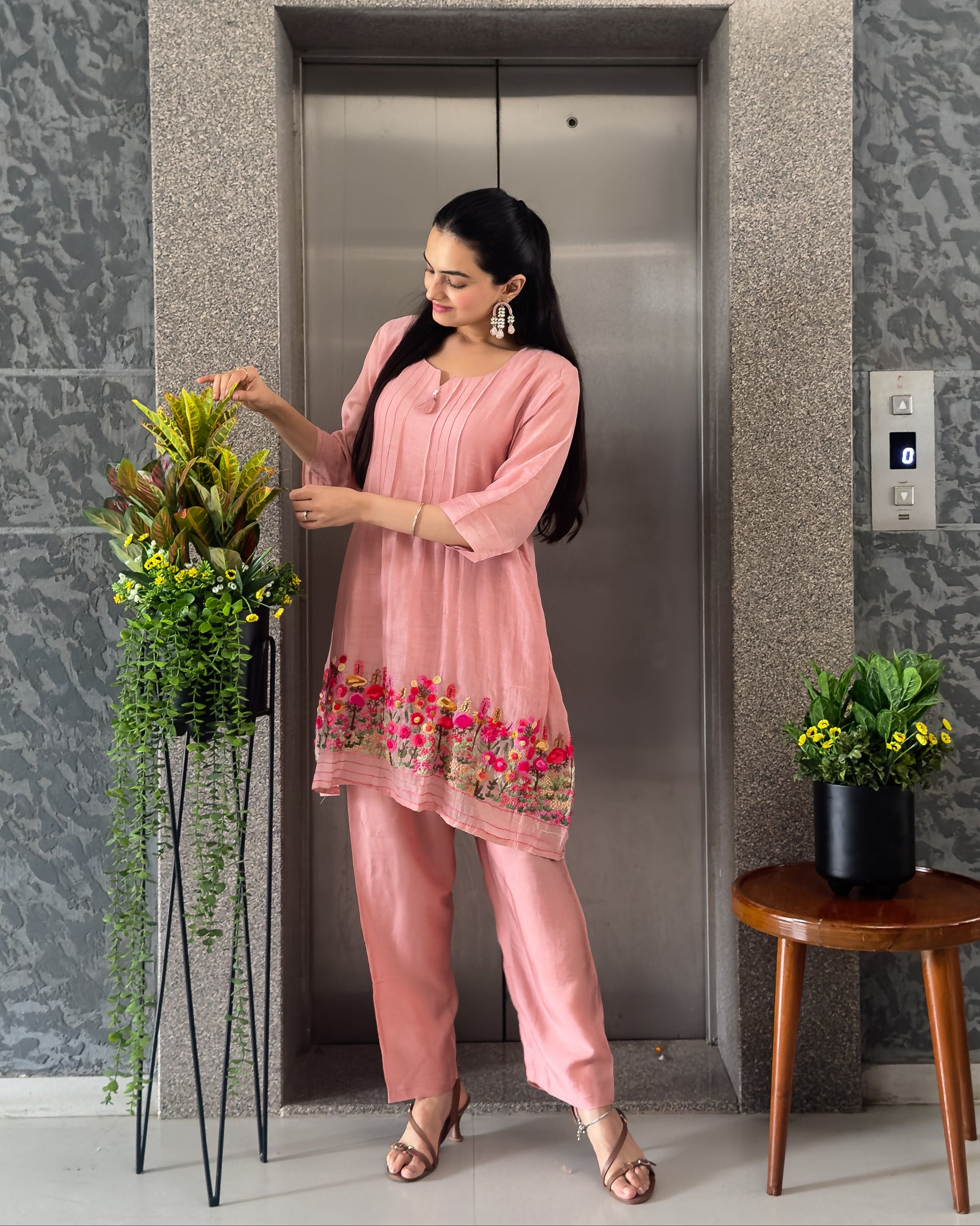 This Light Pink Mal Chanderi Co ord Set for Women is made from soft Mal Chanderi fabric with smooth satin cotton pants, giving a rich and comfortable feel. The round yog...