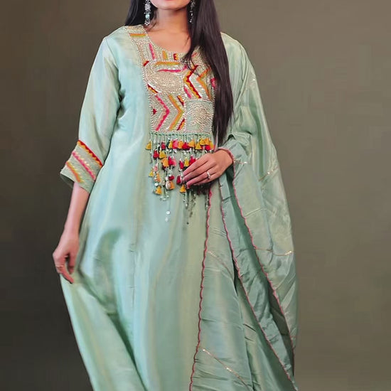 Pista A-Line Kurta Pant Set with dupatta is crafted from soft Shimar tissue fabric, giving it a rich shine and smooth touch. Designed with a round neck and handwork detailing with...