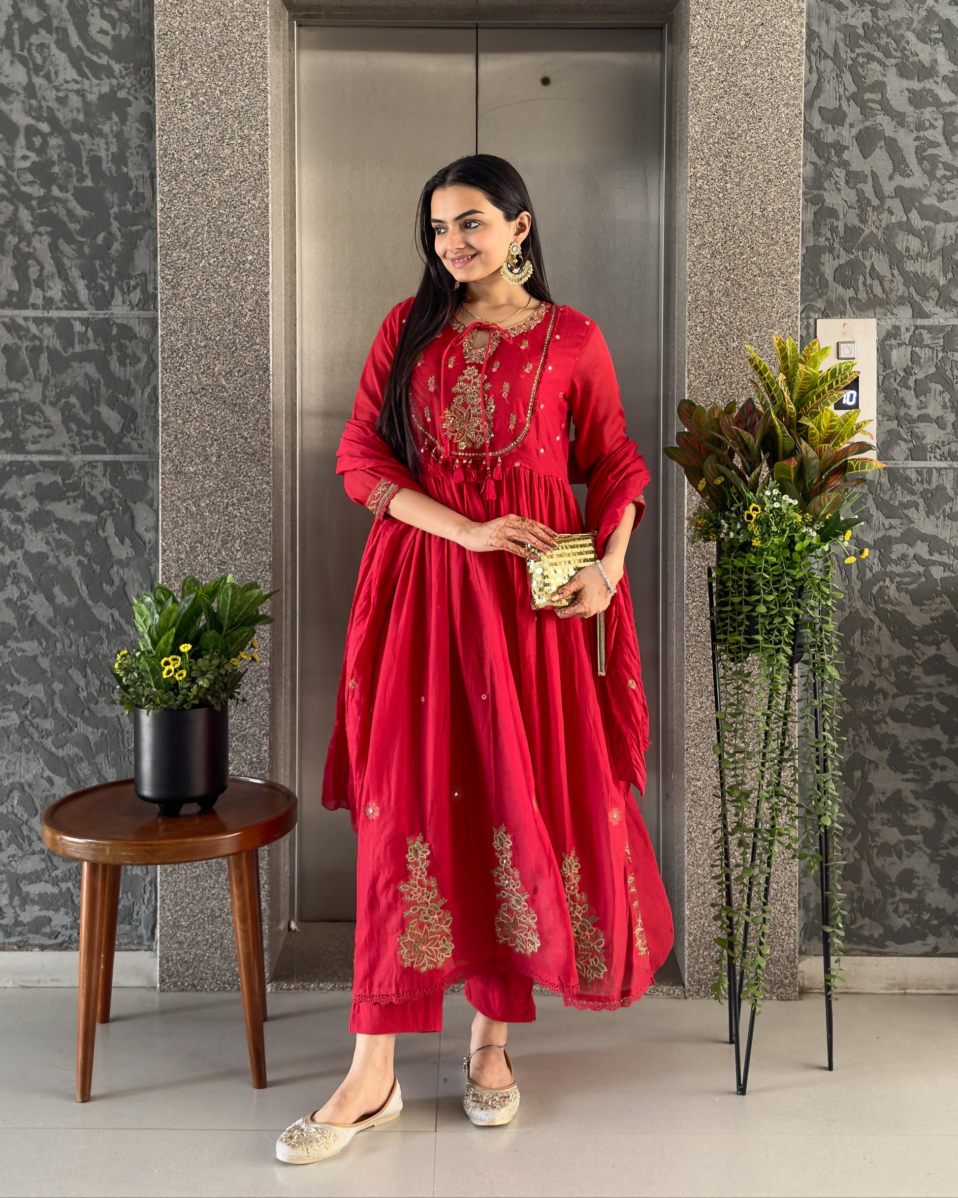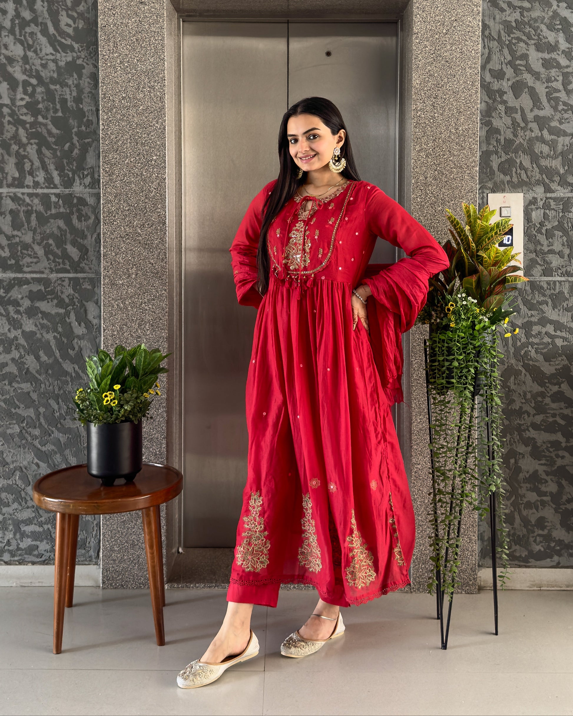 Red Round Kurta Pant Set with Dupatta