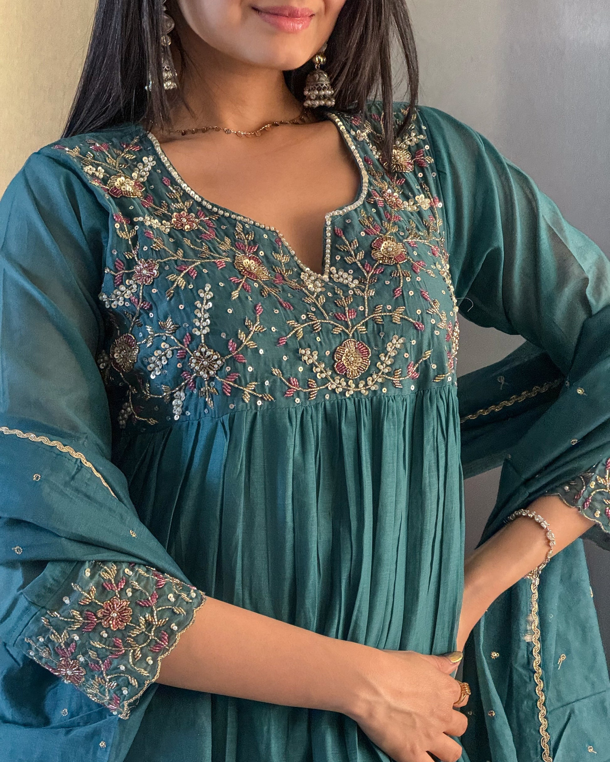 Teal Blue A-Line Kurta Pant Set With Dupatta