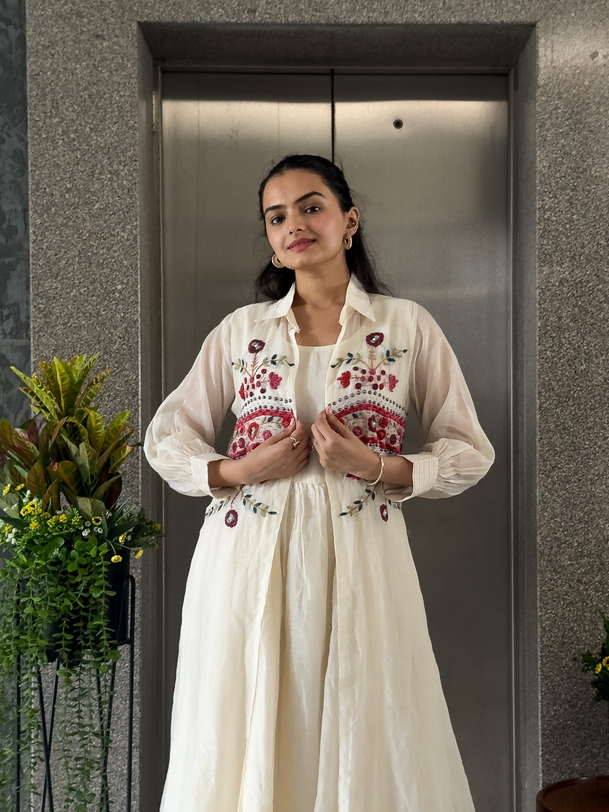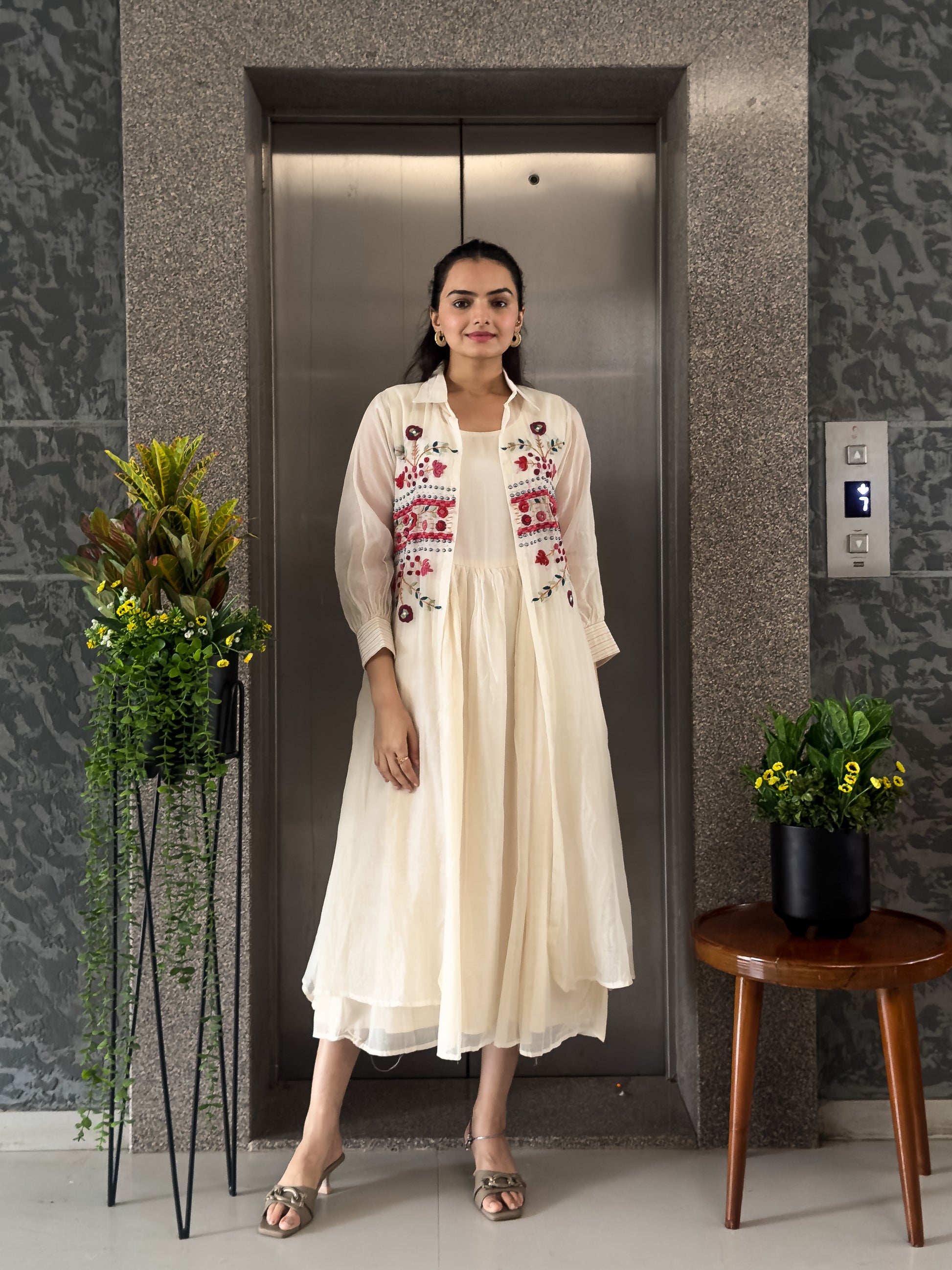 Ideal for holiday outings, parties, and evening gatherings. The round dress with collar jacket offers a contemporary fusion of comfort and grace. Mal chanderi fabric adds a subtle sheen that elevates the entire look. A versatile outfit that transitions effortlessly from daytime charm to evening glamour.