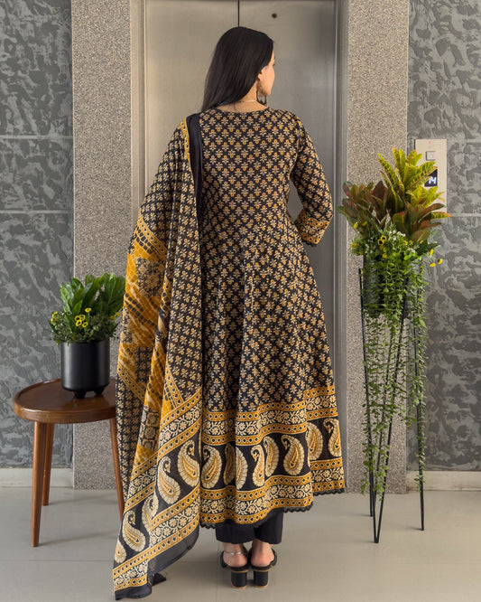 Black mal Cotton Round Kurta Pant Set With Dupatta